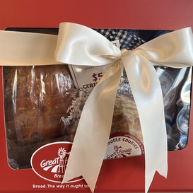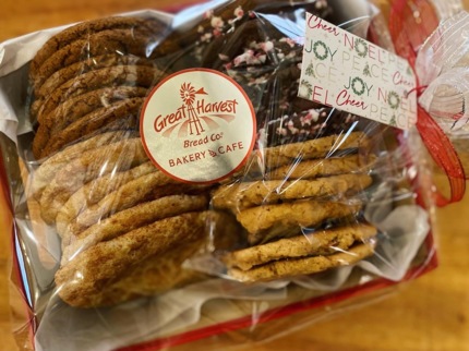 Honey Whole Wheat Bread, Jam/ Butter Spreader, 6 Holiday Cookies,  Apron-Towl, Caramel Tree  Caramel Corn & Great Harvest Gift Card.