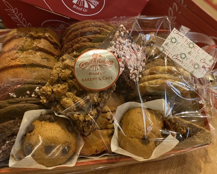 3 kinds of Holiday Cake Breads sliced, 12 Holiday Cookies, Pumpkin Chocolate Chip Muffins, Berry Oatmeal Bars & Peppermint Brownies.