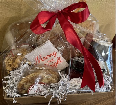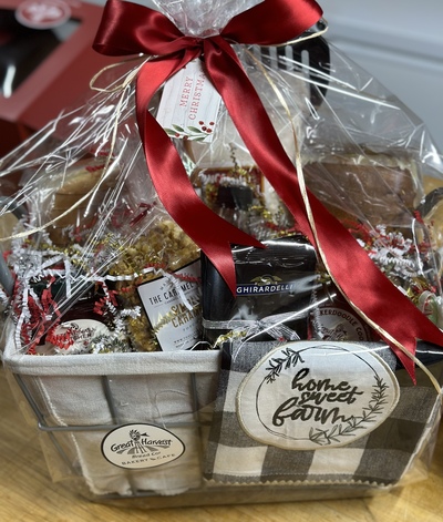 all festivley wrapped in our rustic wire basket with cello, satin bow and Holoiday gift tag.
